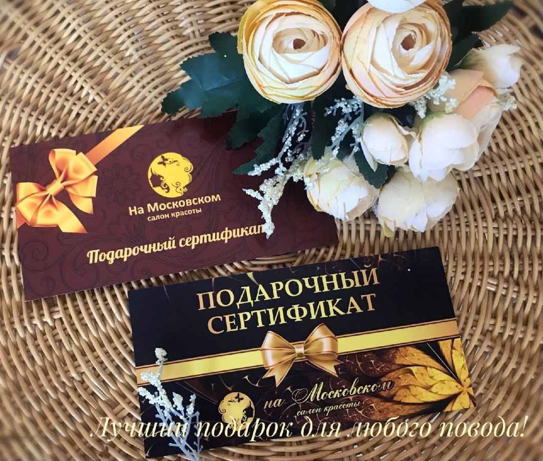 Вы влюблены и хотите признаться? Или же мечтаете сделать приятный и запоминающийся подарок второй половине? Мы поможем Вам произвести неизгладимое впечатление на близкого человека. Салон красоты «На Московском» предлагаем Вам приобрести подарочный сертификат в наш салон красоты. При этом Вы можете выбрать номинал сертификата, исходя из Ваших возможностей, а так же ожиданий и потребностей получателя сертификата — от 1000 рублей и выше.